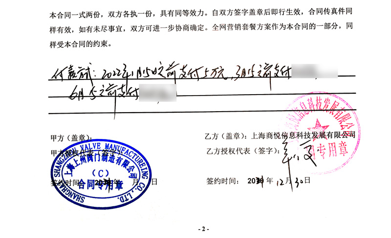 2021年12月30日,上海上州閥門制造有限公司與商悅傳媒簽訂第二年的網絡營銷外包協議。