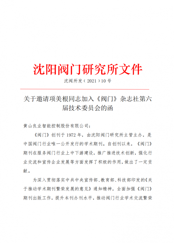 接2021年11月1日《閥門》雜志社邀請函:鑒于黃山良業項美根先生具有端正公道、治學嚴謹的良好道德品行以及在閥門業界享有的上佳美譽聲望和深厚學術造詣,特誠摯邀請項美根同志擔任本刊第六屆技術委員會成員。