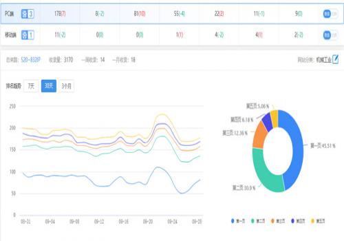 總關鍵詞排名數量178,其中第一頁占比45.51%;第二頁占比30.90%;總詞量排名在前兩頁的占76.41%